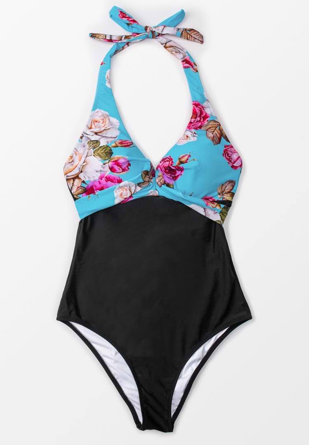 CUPSHE Floral and Black Halter One Piece Swimsuit