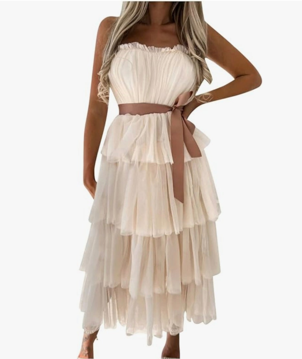 Womens beige tulle tutu strapless midi dress