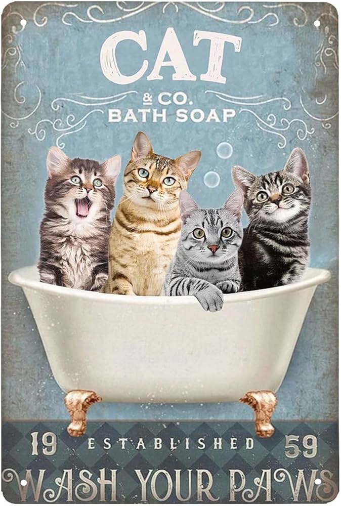 Metal Tin Sign Of Cat Bathing Style,Wash Your Paws Retro Style Poster,Bathroom Art Poster Wall Decor Retro Diner Cafe Home Aluminum Painting 8x12 inch