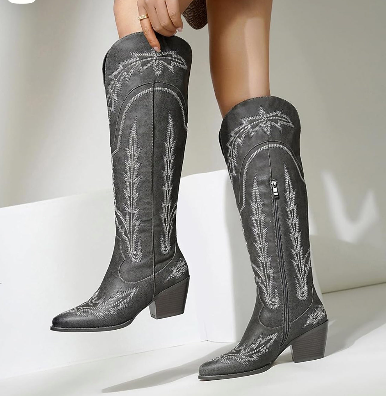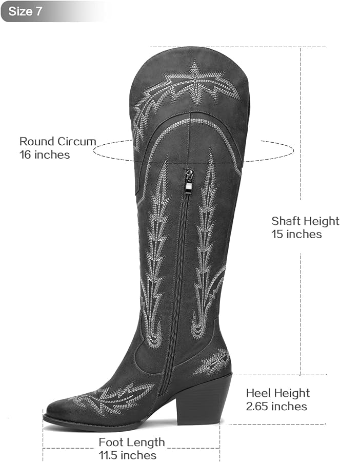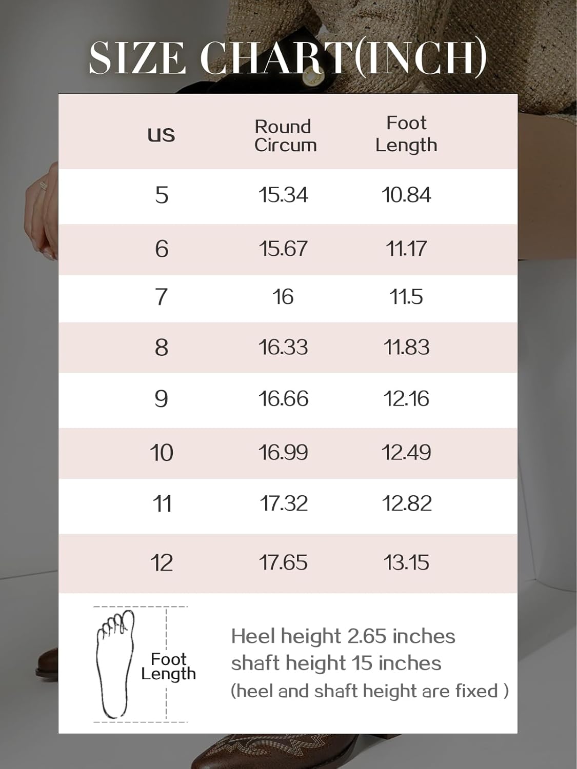 • 【Meausrment】: The women cowboy boots Shaft height 15 inches, shaft cirumference 16 inches, 2.5 inches block heel.